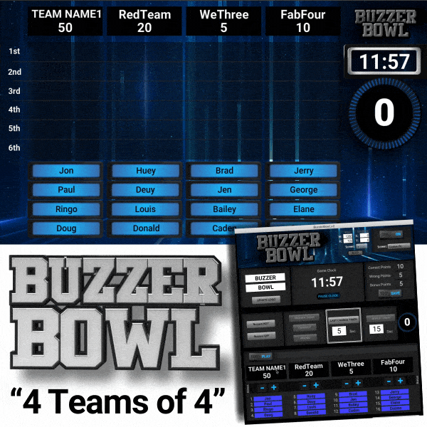 All 16 (4 teams of 4) players are displayed at the bottom of the screen. As they buzz in they are moved up into the order they buzzed in. This unique style of display lets you see who buzzed in, their order, and what team they are on. The game clock is on the right side of the screen, and below that is the "Bonus" and "Last Chance" timer".