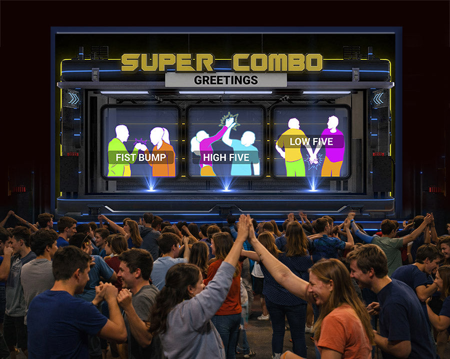 "Are you all ready to play SUPER COMBO! This is an elimination game, we all play but only 1 team will win. Everybody stand up and get a partner. All you have to do is act out a "combo" from the screen. If your combos gets a "X" you are out. We got some crazy categories to pick from let's see our first one...